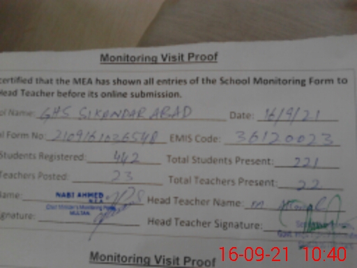 | EMIS Code: 36120023 | Name of School: GHS SIKANDER ABAD | |||