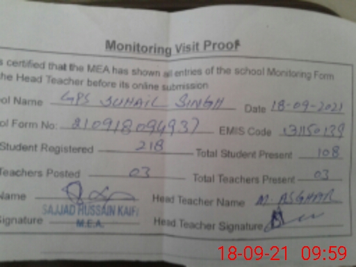 | EMIS Code: 31150139 | Name of School: GPS SUHAIL SINGH | |||