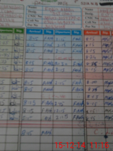| CNIC | Full Name | Designation | R/C | Absence During Last Calender Month |