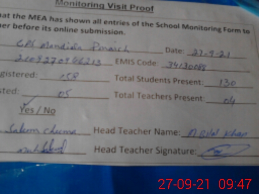 | Attendance Register | Head Teacher | MEA with School | Visit Proof |