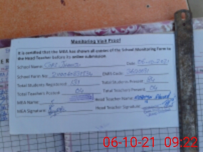 | Total no. of Classrooms: 6 No. of Classrooms Used for Teaching: 3 No. of Classrooms Storing Old Furniture, FTBs, etc: 0Comments if Any: One teacher muhammad bilal posted on 30 sep 2020 nearly since one year but name is not in tab |
