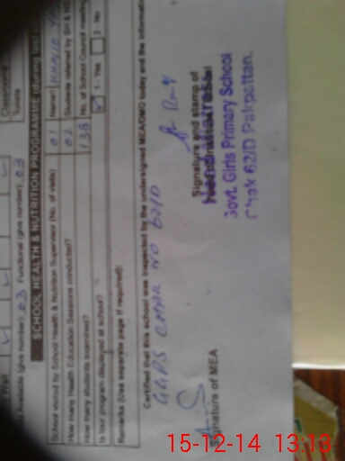 | School Visited by School Health & Nutrition Supervisor (No. of Visits) | 1 | Name1: | KHALID YASIN | Name2: | |