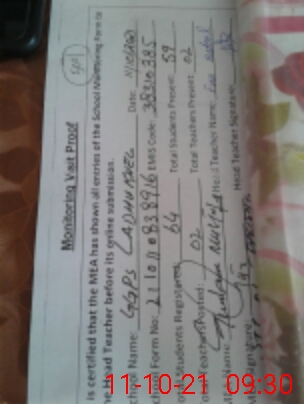 | Attendance Register | Head Teacher | MEA with School | Visit Proof |