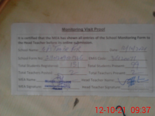 | Attendance Register | Head Teacher | MEA with School | Visit Proof |