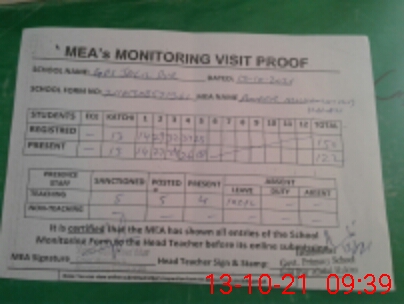 | Attendance Register | Head Teacher | MEA with School | Visit Proof |