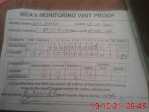 | Certified that this School was Inspected by the Undersigned MEA/DMO Today and the Information Stated Above is as Per Record. | |||||