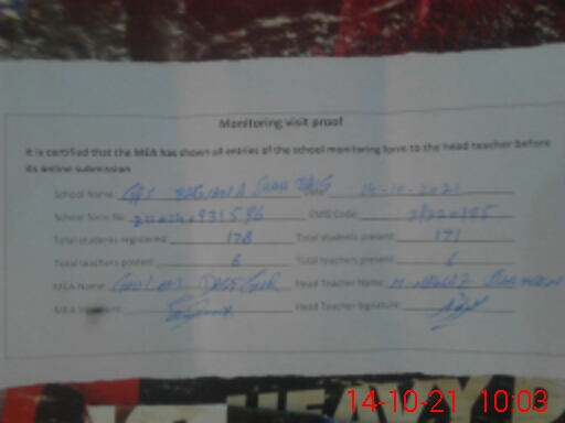 | Attendance Register | Head Teacher | MEA with School | Visit Proof |