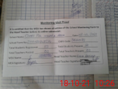 | Attendance Register | Head Teacher | MEA with School | Visit Proof |