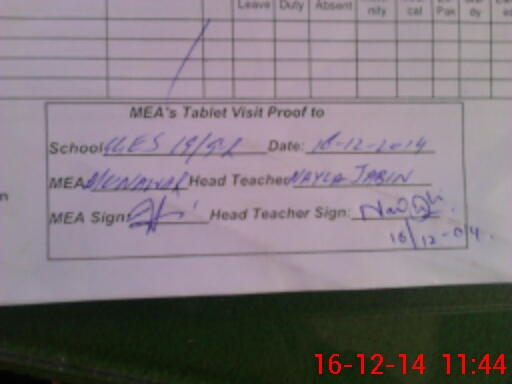 | Attendance Register | Head Teacher | MEA with School | Visit Proof |