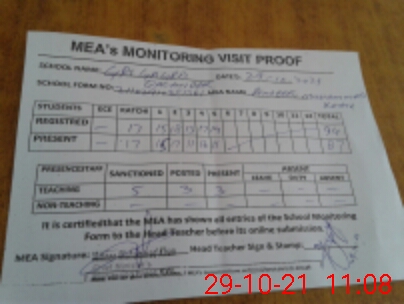 | Attendance Register | Head Teacher | MEA with School | Visit Proof |