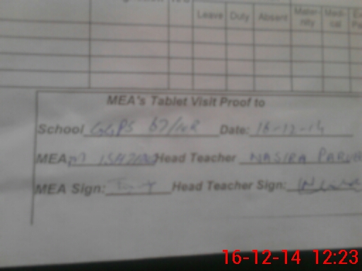 | Attendance Register | Head Teacher | MEA with School | Visit Proof |