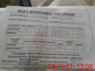 | Attendance Register | Head Teacher | MEA with School | Visit Proof |
