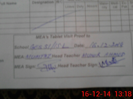 | Attendance Register | Head Teacher | MEA with School | Visit Proof |