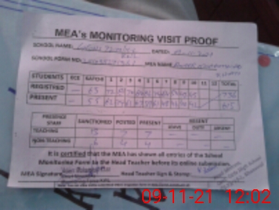 | Attendance Register | Head Teacher | MEA with School | Visit Proof |