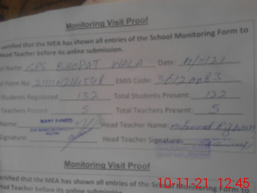 | Name: Mu**** Ri**** As**** Designation: (School Headmaster's/Headmistress's) PSTHEAD TEACHER Phone/Cell Number: 03**** |