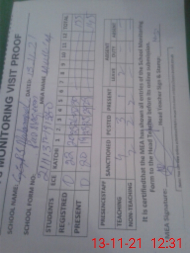 | Attendance Register | Head Teacher | MEA with School | Visit Proof |