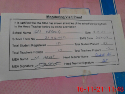 | Attendance Register | Head Teacher | MEA with School | Visit Proof |