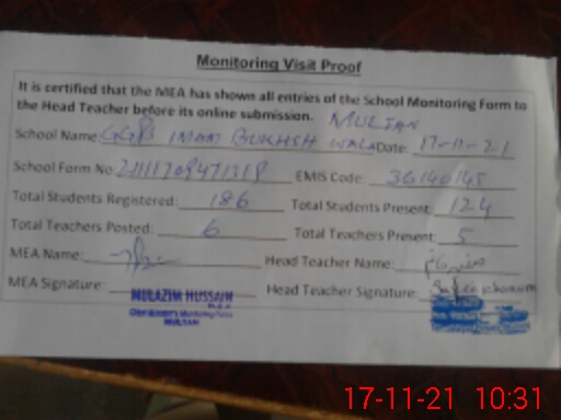 | Certified that this School was Inspected by the Undersigned MEA/DMO Today and the Information Stated Above is as Per Record. | |||||