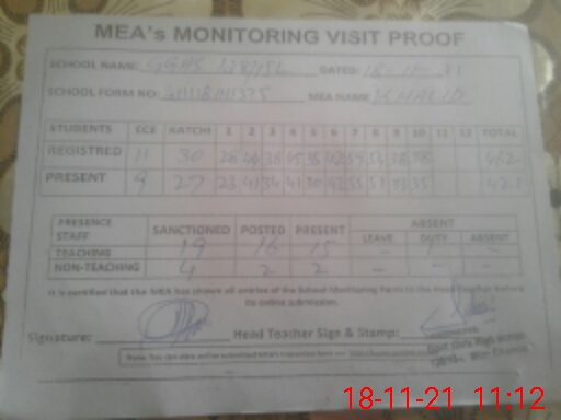 | Attendance Register | Head Teacher | MEA with School | Visit Proof |