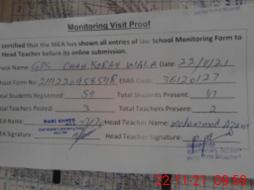 | EMIS Code: 36120127 | Name of School: GPS CHAH KORAY WALA | |||