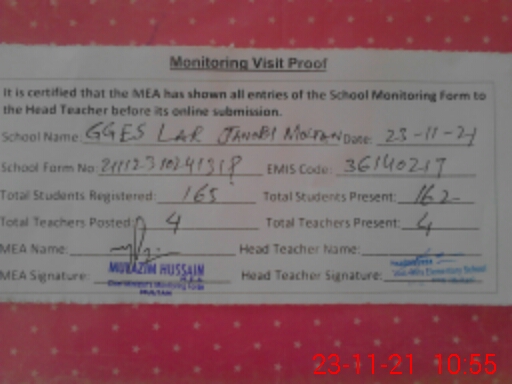 | Certified that this School was Inspected by the Undersigned MEA/DMO Today and the Information Stated Above is as Per Record. | |||||