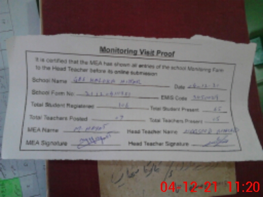 | Certified that this School was Inspected by the Undersigned MEA/DMO Today and the Information Stated Above is as Per Record. | |||||