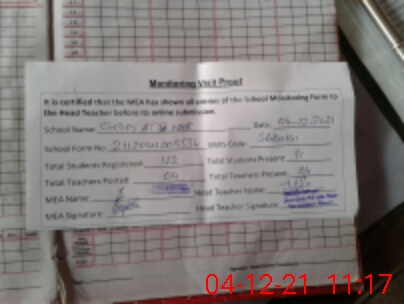 | Attendance Register | Head Teacher | MEA with School | Visit Proof |