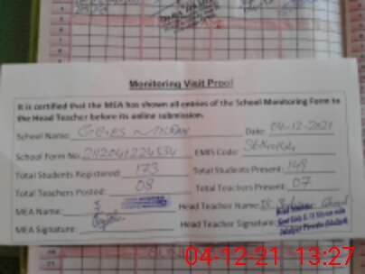 | Attendance Register | Head Teacher | MEA with School | Visit Proof |