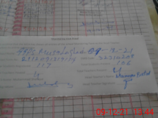 | Attendance Register | Head Teacher | MEA with School | Visit Proof |
