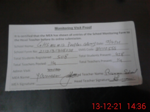 | EMIS Code: 34110555 | Name of School: GHS MC NO.12 PEOPLES COLONY | |||