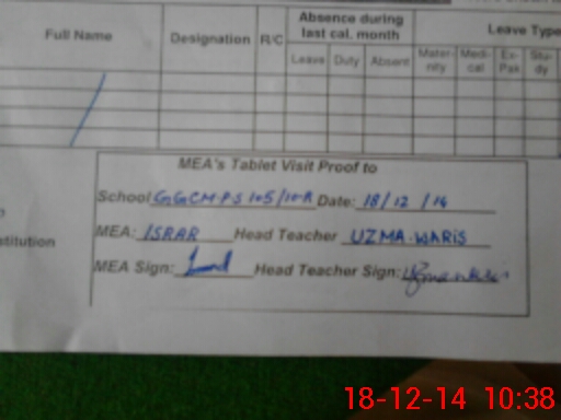 | Attendance Register | Head Teacher | MEA with School | Visit Proof |