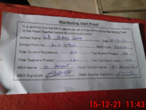 | Certified that this School was Inspected by the Undersigned MEA/DMO Today and the Information Stated Above is as Per Record. | |||||