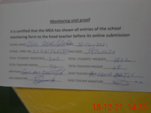 | Attendance Register | Head Teacher | MEA with School | Visit Proof |