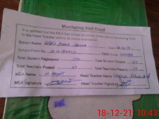 | Certified that this School was Inspected by the Undersigned MEA/DMO Today and the Information Stated Above is as Per Record. | |||||