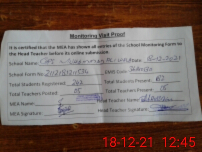 | Certified that this School was Inspected by the Undersigned MEA/DMO Today and the Information Stated Above is as Per Record. | |||||