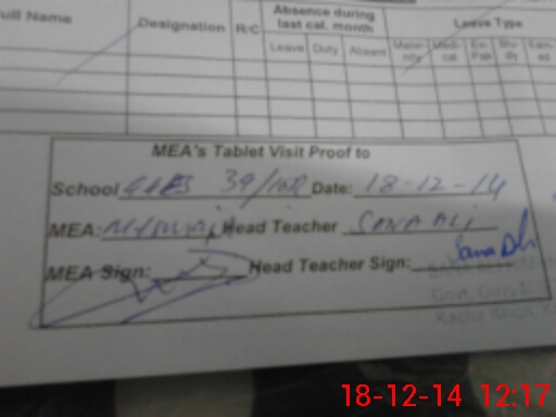 | Attendance Register | Head Teacher | MEA with School | Visit Proof |