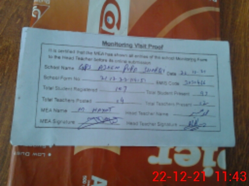 | Attendance Register | Head Teacher | MEA with School | Visit Proof |