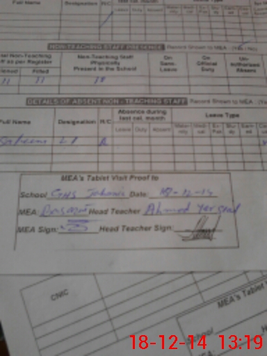 | Attendance Register | Head Teacher | MEA with School | Visit Proof |