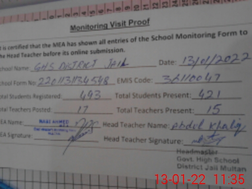 | EMIS Code: 36110047 | Name of School: GHS DISTRICT JAIL MULTAN | |||