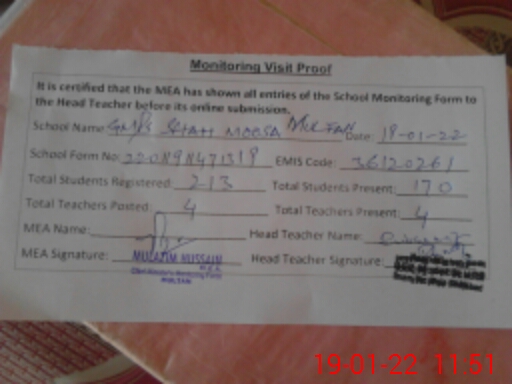 | EMIS Code: 36120261 | Name of School: GMPS SHAH MUSA (IMAM DIN WALA) SHUJABAD | |||