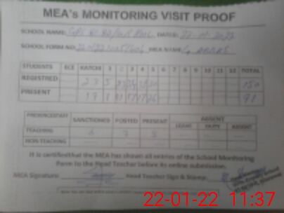| Attendance Register | Head Teacher | MEA with School | Visit Proof |