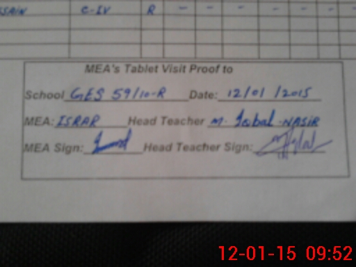 | Attendance Register | Head Teacher | MEA with School | Visit Proof |