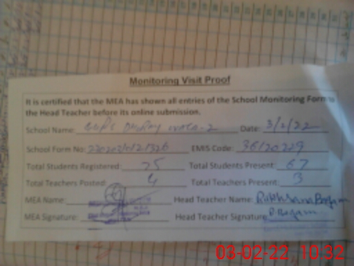 | EMIS Code: 36120229 | Name of School: GGPS DHORAY WALA NO. 2 SHUJABAD | |||