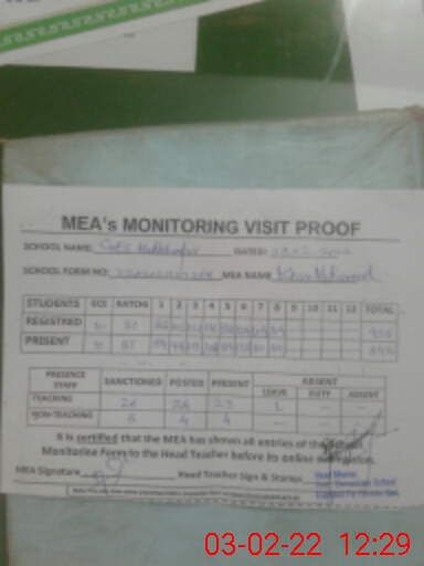 | Attendance Register | Head Teacher | MEA with School | Visit Proof |