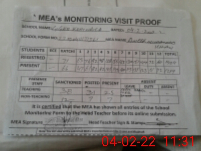 | Attendance Register | Head Teacher | MEA with School | Visit Proof |