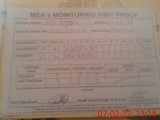 | Attendance Register | Head Teacher | MEA with School | Visit Proof |