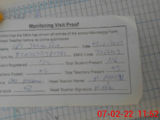 | EMIS Code: 31150103 | Name of School: GPS JAHAN PURA | |||