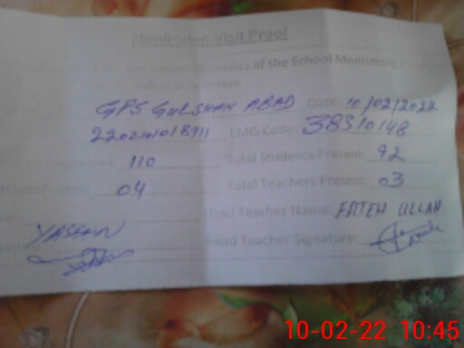 | EMIS Code: 38310148 | Name of School: GPS GULSHAN ABAD PO KAMAR MUSHANI | |||