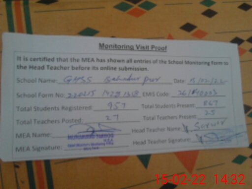 | EMIS Code: 36140003 | Name of School: GHSS BAHADAR PUR | |||