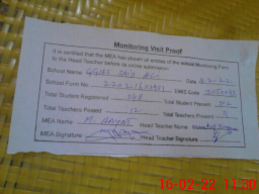 | EMIS Code: 31150043 | Name of School: GGHS SAID ALI | |||